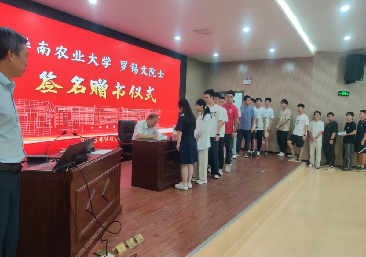 随后,现场举行了罗锡文院士的签名赠书仪式,罗院士将其传记《开直播机的老头》亲手签名并赠予学生代表,他希望同学们能够继承和发扬科学家精神,崇尚科学、勇于创新、敢于担当、追求卓越,为推动农业现代化建设贡献自己的力量。