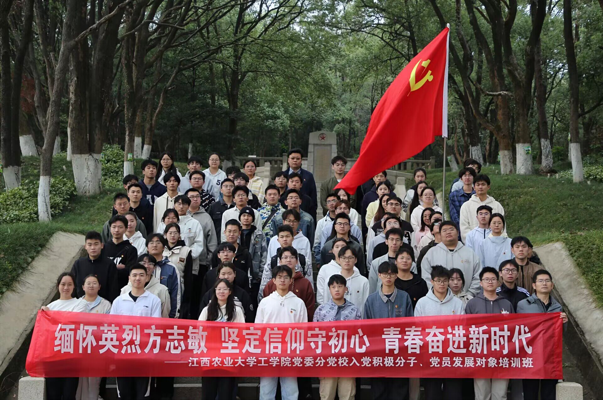 为深入学习贯彻习近平新时代中国特色社会主义思想,切实加强青年学生理想信念教育,引导广大青年坚定听党话、跟党走的政治自觉,10月21日下午,工学院党委组织党员发展对象、入党积极分子等青年学生,赴方志敏烈士陵园开展“缅怀英烈方志敏,坚定信仰守初心,青春奋进新时代”主题教育活动,以红色教育筑牢青年思想根基。院团委负责人,部分学生骨干,各学生党支部党员发展对象、入党积极分子近100人参加。